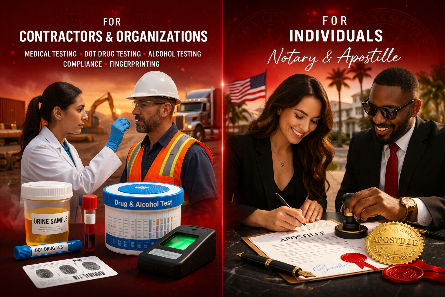 Our core capabilities include drug and alcohol testing, mobile specimen collection, identity verification through fingerprinting, and secure documentation services such as notarization and certified translations.
